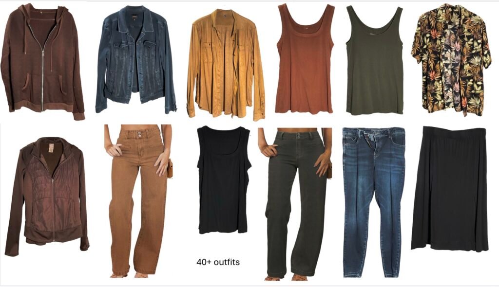 Having fewer clothes that mix and match can save you money as in the photo below. With these few pieces, you can create more than 40 outfits.